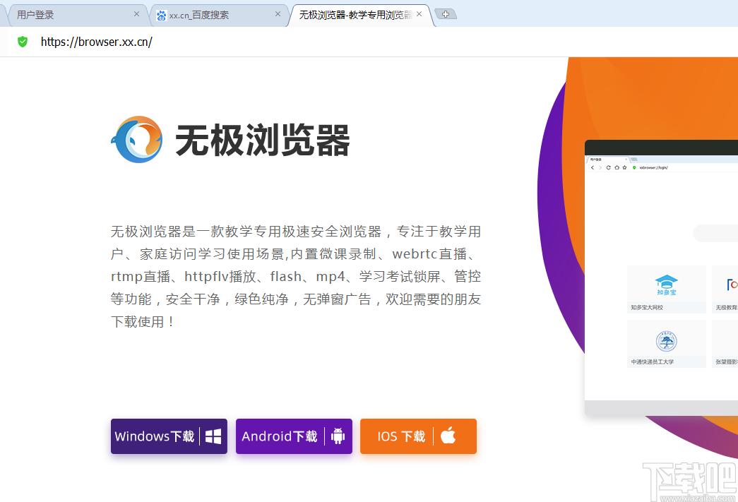 无极浏览器是一款功能强大专业实用的教学专用极速安全浏览器软件,该软件专注于用户教学、家庭访问等学习相关场景进行使用,用户可以通过该软件进行快速学习资源、各种网页内容快速搜索,该软件绿色安全、页面纯净无弹窗广告,为用户提供良好的网页浏览环境;无极浏览器这款浏览器软件内置有微课录制、各种直播功能、学习考试锁屏、管控等功能,为用户提供一对一教学、完善的设备直播教学环境,让用户可以通过该软件尊享高质量高品质的视频教学,欢迎有需要的朋友下载使用。